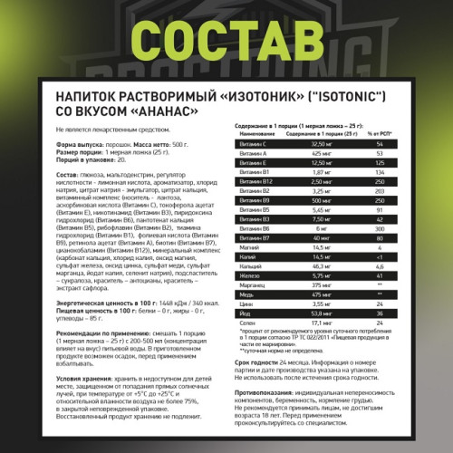 Изотоник — функциональный напиток, созданный для быстрого восполнения жидкости и электролитов во время физических нагрузок. Он помогает поддерживать водно-солевой баланс, снижает риск обезвоживания и способствует сохранению энергии при длительных тренировках или активном образе жизни. Благодаря сбалансированному составу изотоник помогает быстрее восстанавливаться после нагрузок, поддерживает выносливость и улучшает общее самочувствие. Напиток легко усваивается и подходит как профессиональным спортсменам, так и любителям фитнеса. Удобный формат позволяет использовать его до, во время или после тренировки, помогая сохранять продуктивность и комфорт при любой активности.
