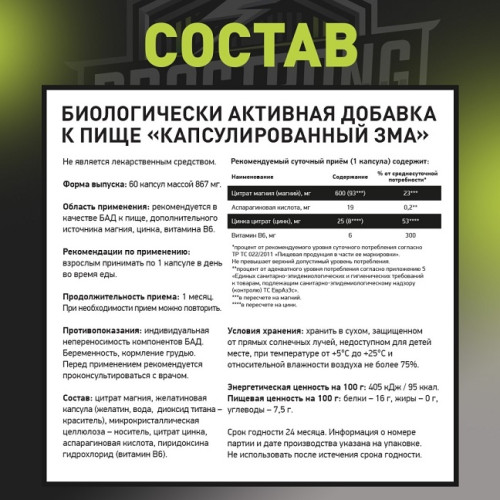 ZMA — это комплекс цинка, магния и витамина B6, созданный специально для поддержки организма при регулярных физических нагрузках. Формула помогает улучшать восстановление после тренировок, поддерживает нормальную работу мышц и нервной системы, а также способствует качественному сну, который важен для роста и восстановления. Цинк участвует в обменных процессах и поддерживает иммунитет, магний помогает снижать мышечное напряжение, а витамин B6 улучшает усвоение компонентов. ZMA особенно подходит спортсменам и активным людям, стремящимся сохранить высокий уровень энергии и выносливости. Удобный формат приема легко вписывается в ежедневный режим и дополняет сбалансированное питание.